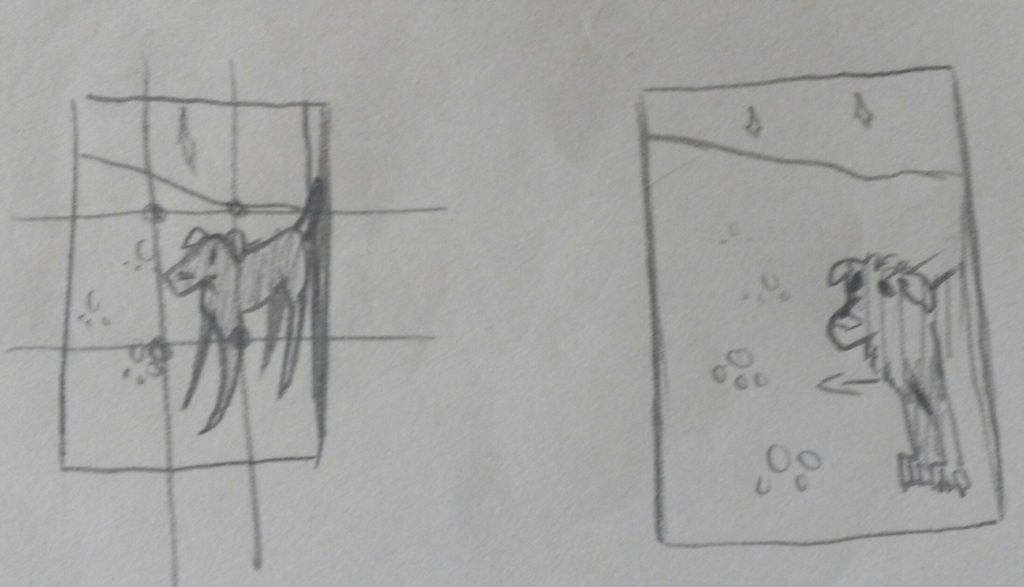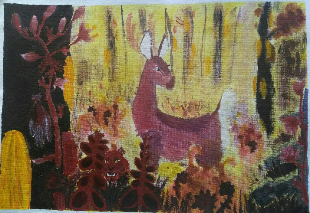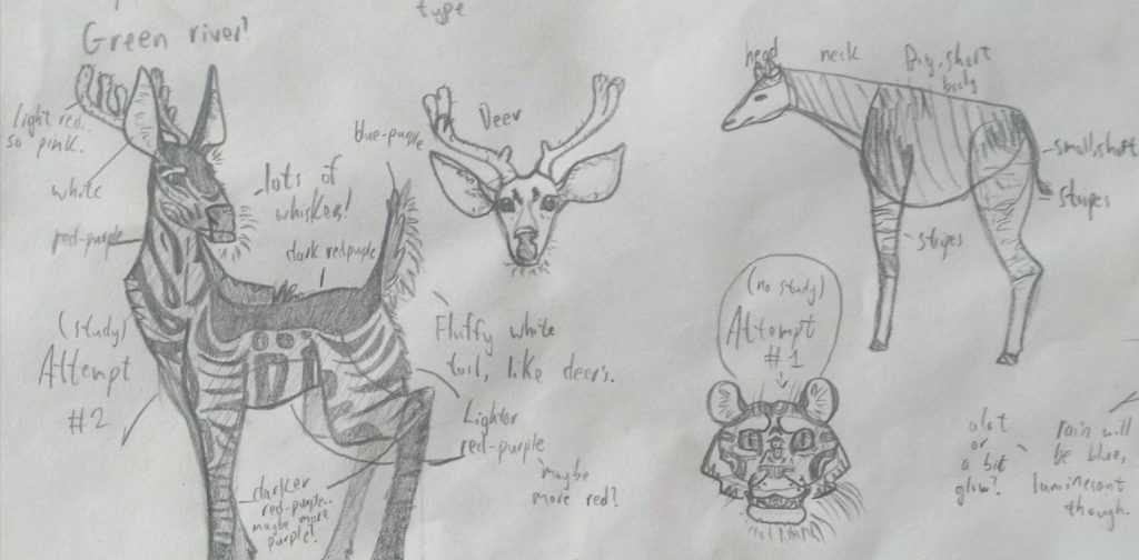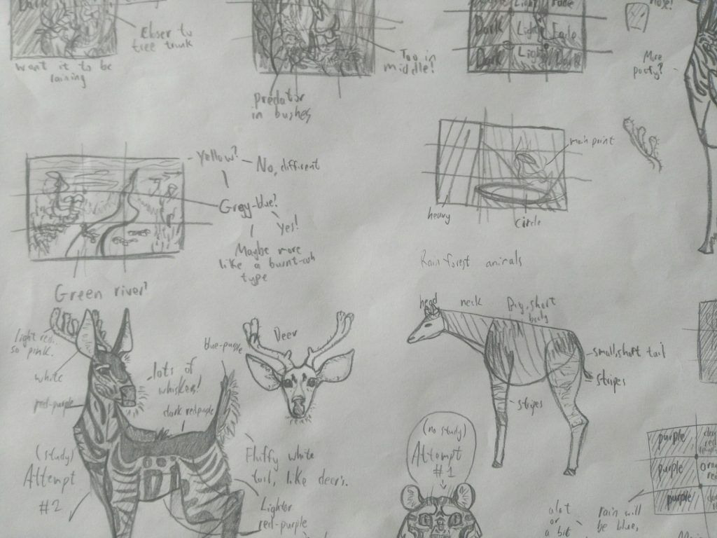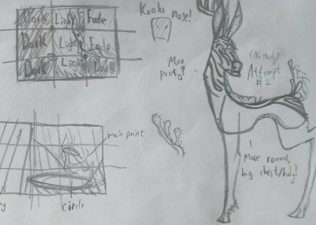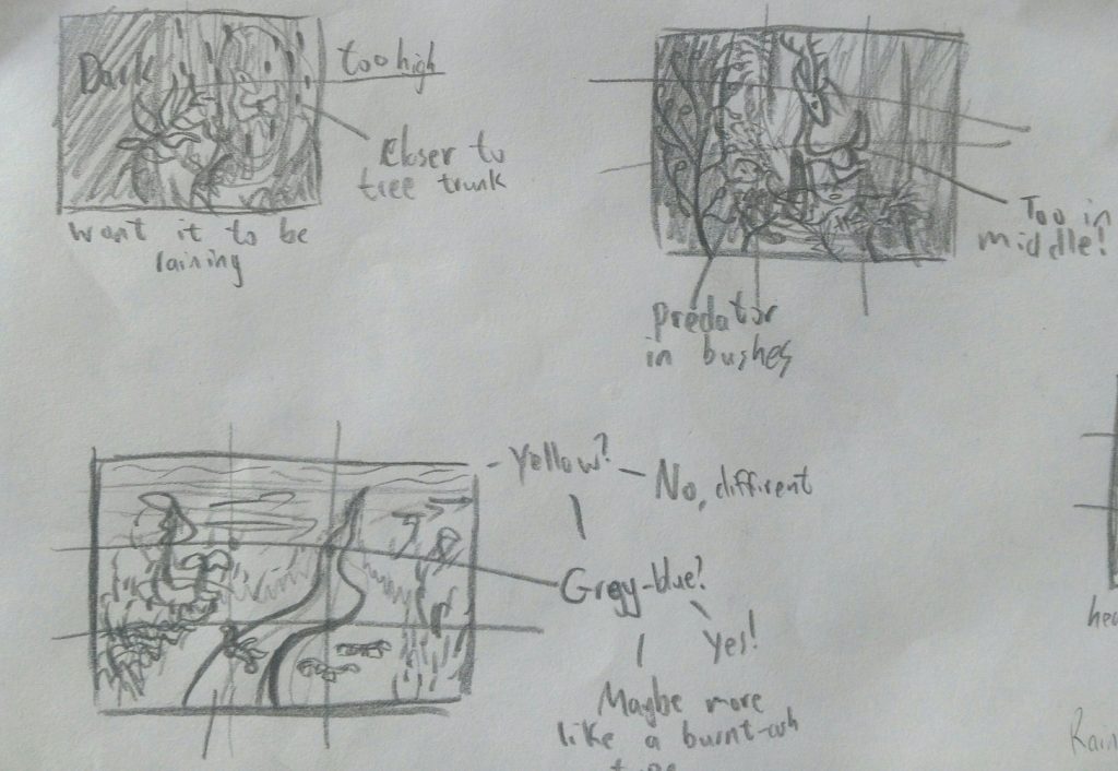Then I decided to stick with the rainforest one, and here I sketched out where the lights and darks would be, and the first attempt of the deer. I didn’t do any studying of other creatures, so it’s body does look pretty weird.