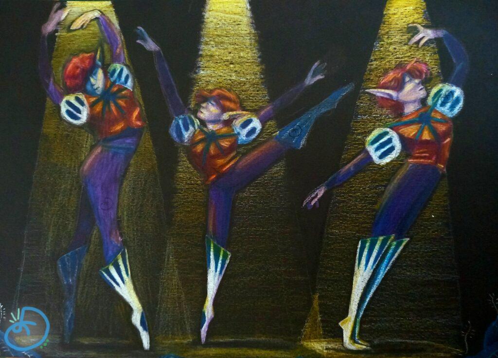 Like I said before, this artwork was mainly worked on in Art Class. But close to the end I finished it at home. We were going to do illustration with color pencils; my teacher and I agreed to do pencils because I had a whole box-full of quality color pencils. I was eager to learn how to use them! I was also given the challenge to include moving figures. At some point I thought of Jester; his dancing. I swiftly sketched small figures of him- he was perfect for the job.