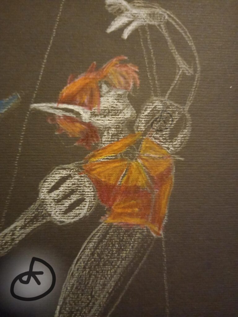 Using Jester as a subject made me excited, it was going to be the first time I use an original character in Art Class! I sketched bigger, more detailed figures for him, and thought out a composition for the piece. I decided to use black paper, to emphasize the night-time theme I would do. I enjoyed sketching, every pencil mark added more motivation for the final artwork next time.